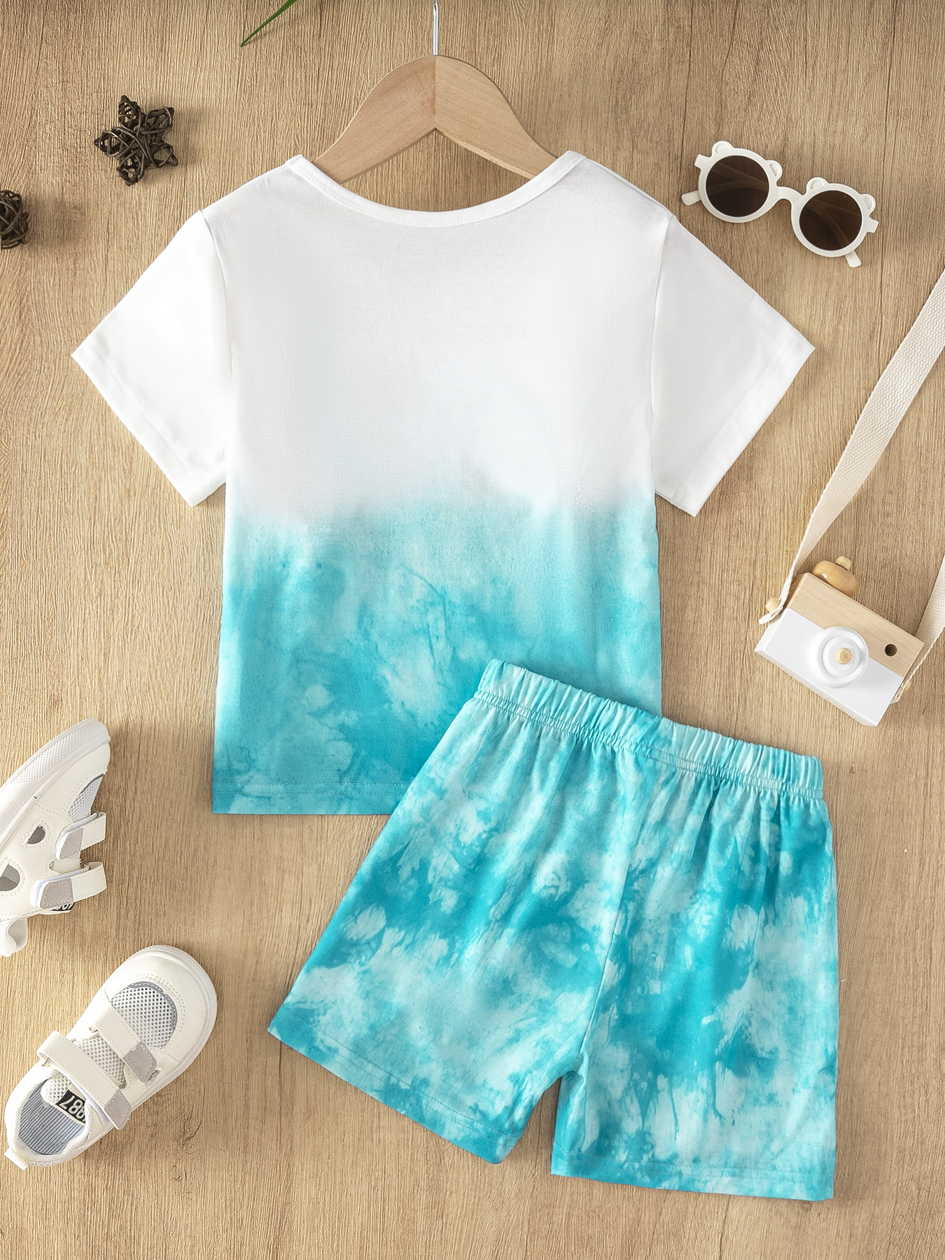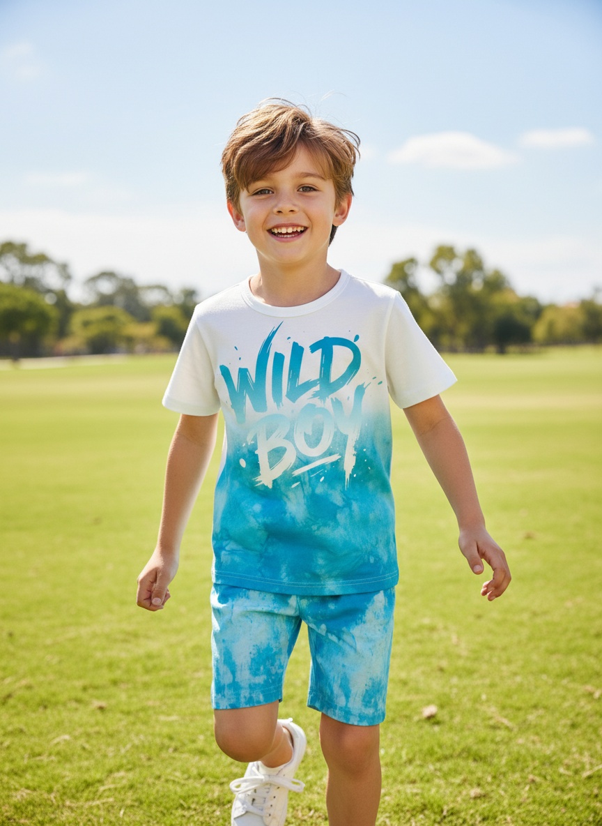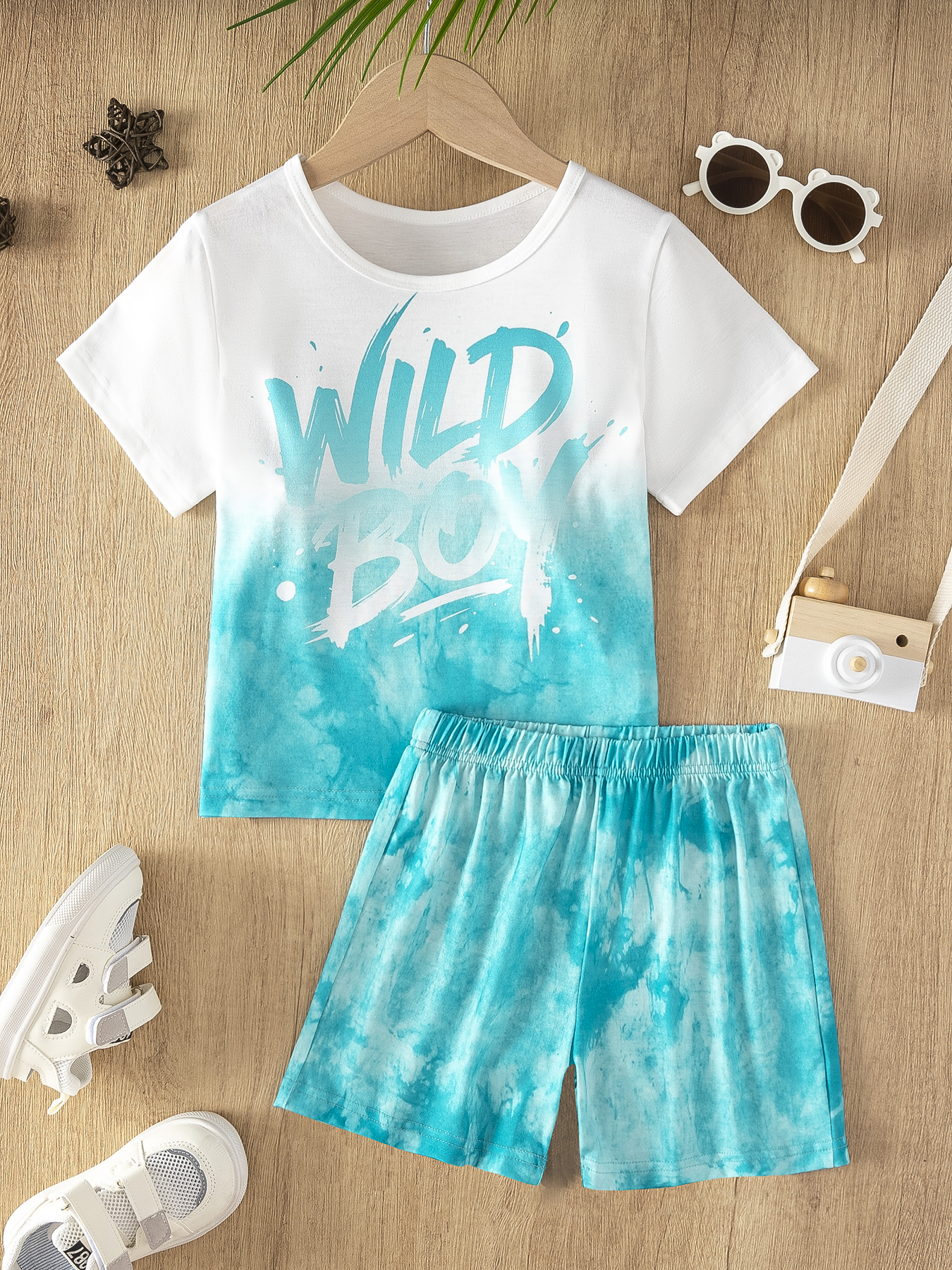 2-Piece Summer Crew Neck Short Sleeve T-shirt and Shorts Set, Boys' Tie-dye Style Outfit, with Personalized "WILD BOY" Print, Loose Fit, Suitable for Daily Home Wear, Outdoor Play, and Summer Beach Tr