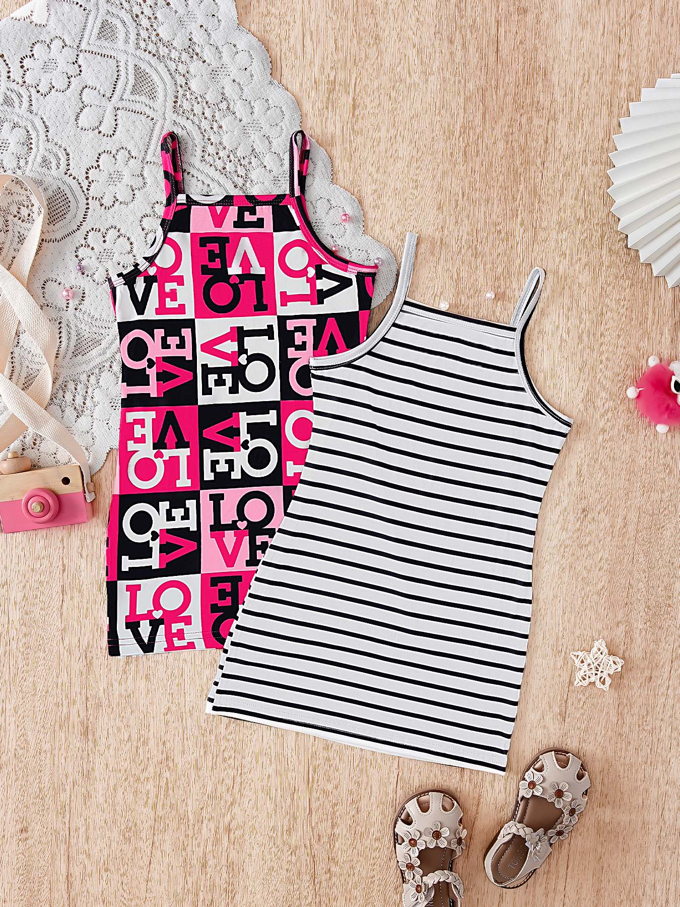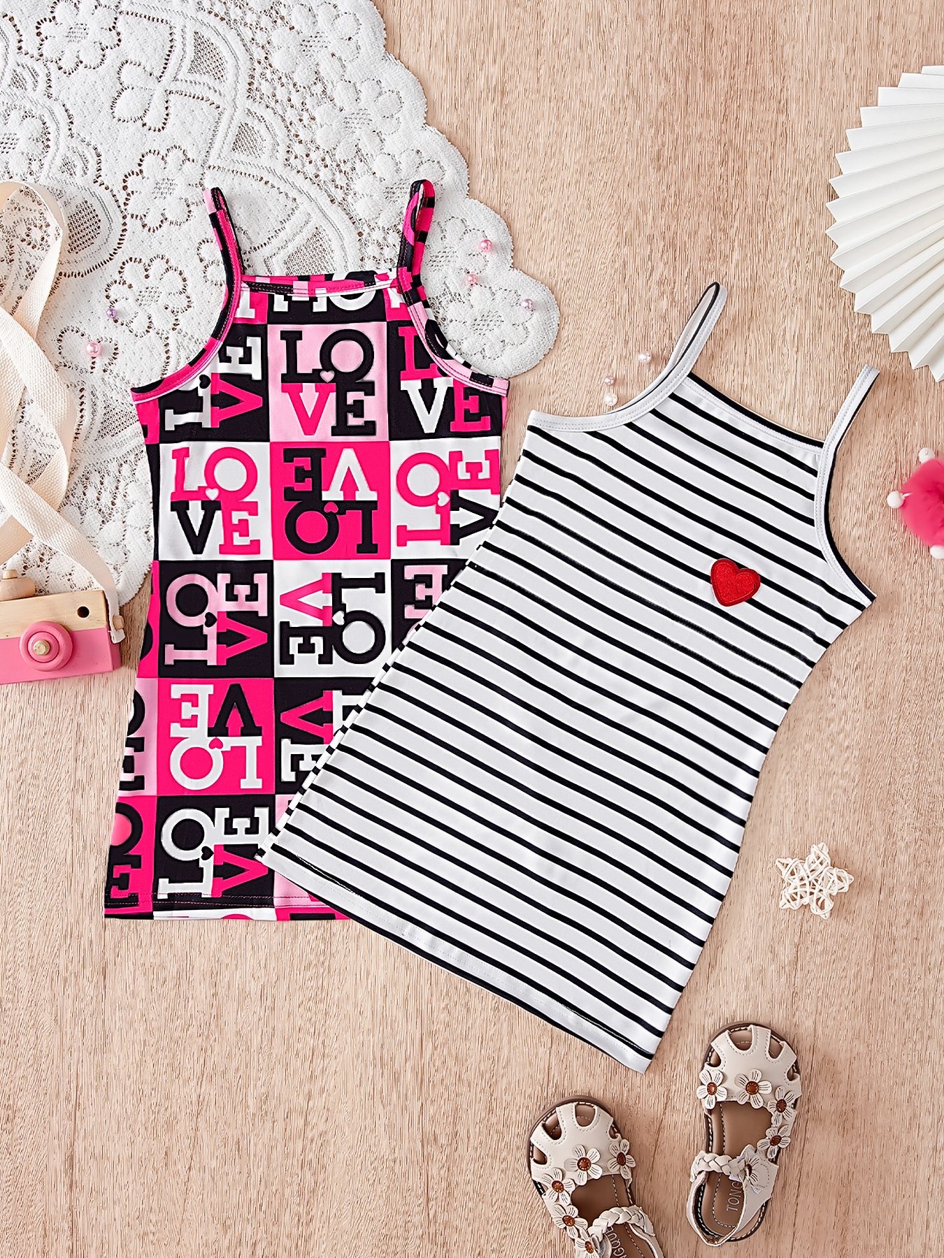 2-piece set of girls' casual cute random letter print & striped heart print camisole dresses, for outdoor casual wear, cute dresses for girls. Perfect for baby girls to wear when going out for outdoor