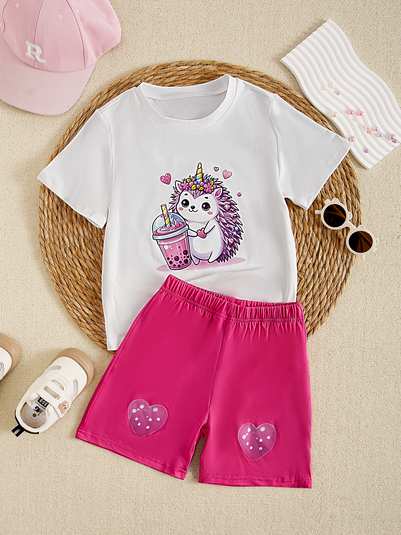 New Fashion Casual Loose Crew Neck Short-sleeve Top + Pink Shorts for Little Girls, Summer Collection, Adorned with Cute Hedgehog and Milk Tea Patterns, Refreshing and Versatile