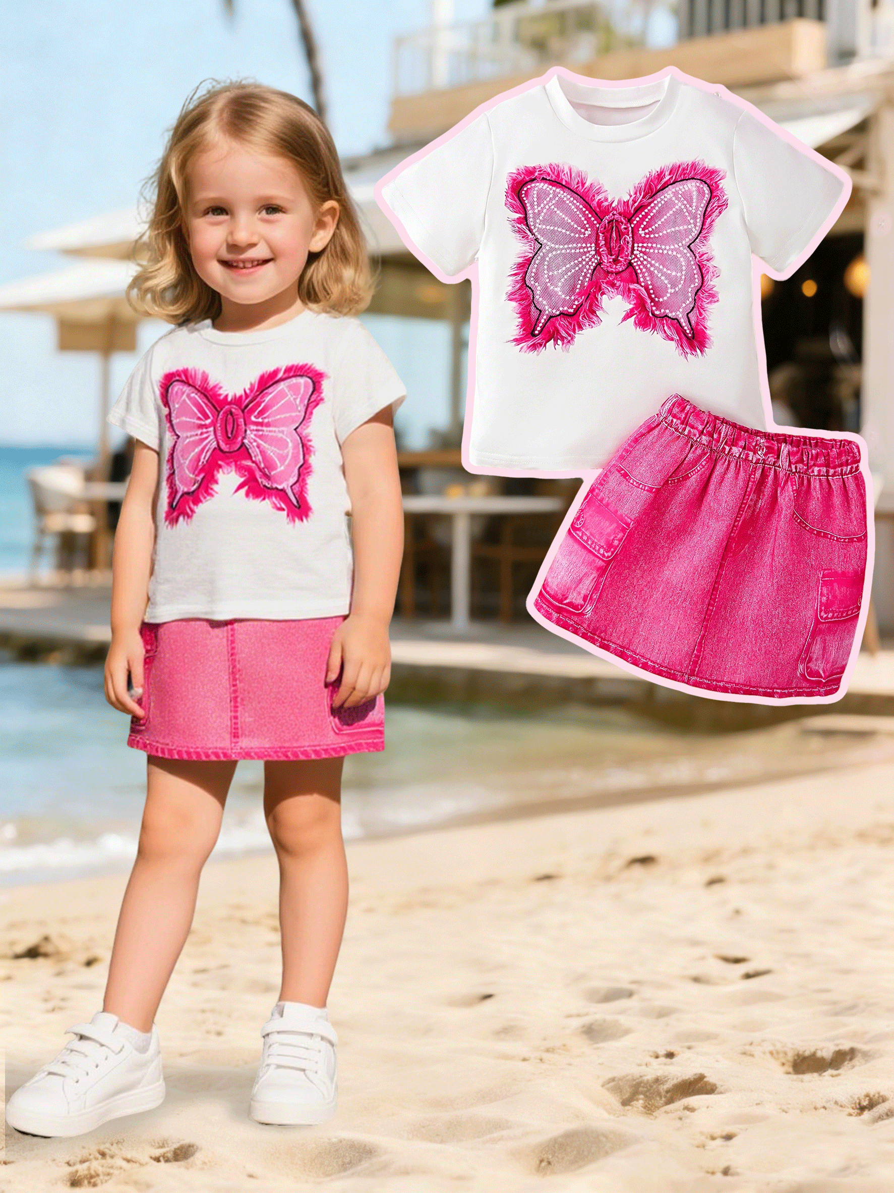 New Summer Fashion Casual Loose Crew Neck Short-Sleeve Top + Pink Shorts Set for Little Girls, featuring cute hedgehog and milk tea prints, which is fresh and versatile. A two-piece set with a simple