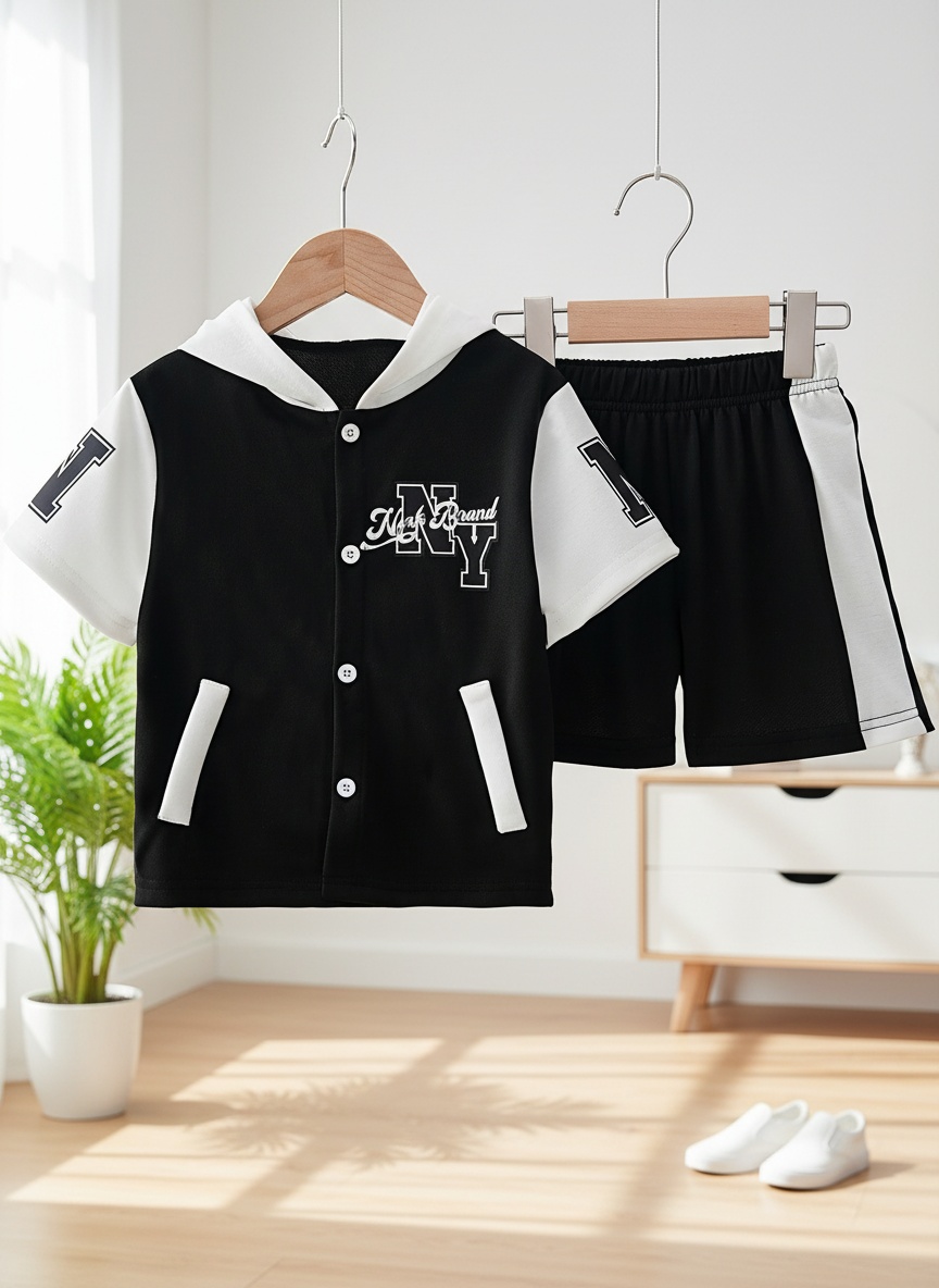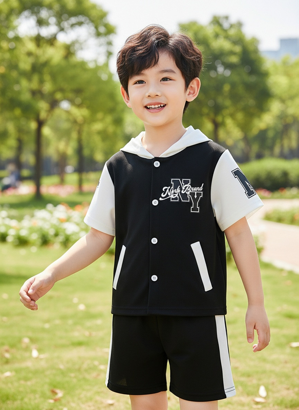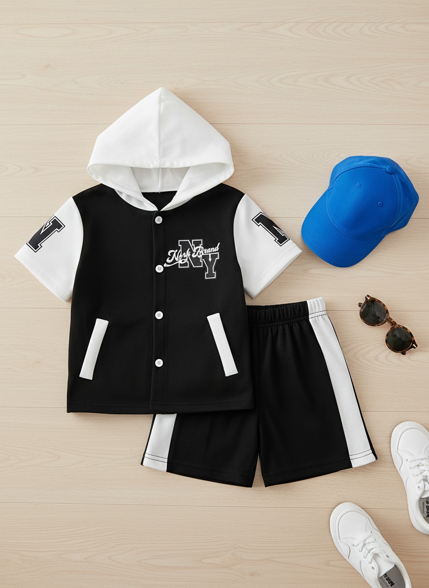Trendy Streetwear Set for Boys (Spring & Summer), 2-Piece Outfit of Color-Blocked Hoodie and Solid-Color Shorts for Ages 4-7, Trendy Breathable Casual Wear for Kids, Sports Set with English Prints, Id